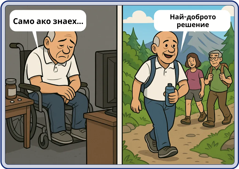 "От години мечтаех да се разходя из Мусала, но коленете ми бяха износени до костите. Лекарят каза, че се нуждая от двойна смяна на ставите. След 60 дни на Synovo не само се разходих из Мусала, но го направих без да спирам нито веднъж от болка. Сега планирам следващото си пътешествие!"