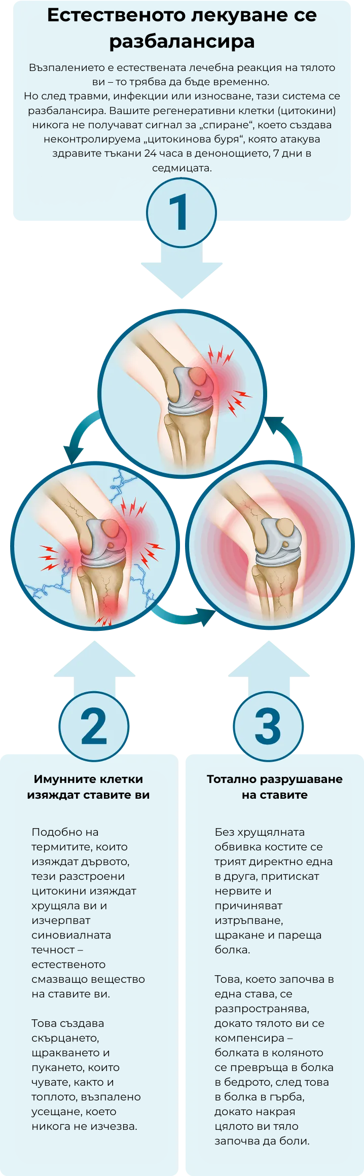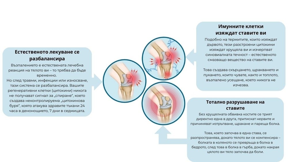 Болкоуспокояващите временно намаляват възпалението, но проучвания в Оксфорд показват, че всъщност ускоряват разграждането на хрущяла.Това е като да изключите алармата за дим, докато къщата ви продължава да гори – те маскират проблема, докато го влошават.